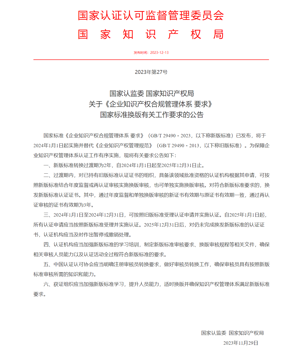 国家认监委 国家知识产权局 关于《企业知识产权合规管理体系 要求》 国家标准换版有关工作要求的公告